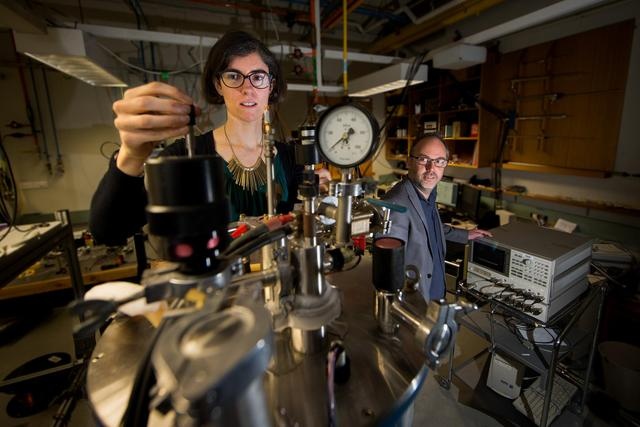 2017年9月,在位于堪培拉的澳大利亞國立大學(xué),負(fù)責(zé)量子數(shù)據(jù)存儲(chǔ)研究的該大學(xué)副教授馬修·塞拉斯(右)與羅絲·阿勒費(fèi)爾特博士在做實(shí)驗(yàn)。(新華社發(fā),斯圖爾特·海伊攝)
