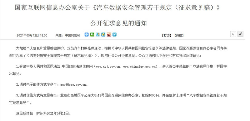 5月12日國(guó)家互聯(lián)網(wǎng)信息辦公室發(fā)布關(guān)于《汽車數(shù)據(jù)安全管理若干規(guī)定(征求意見稿)》公開征求意見的通知。意見明確收集各類型數(shù)據(jù)的目的、用途,數(shù)據(jù)保存地點(diǎn)、期限,或者確定保存地點(diǎn)、期限的規(guī)則等。